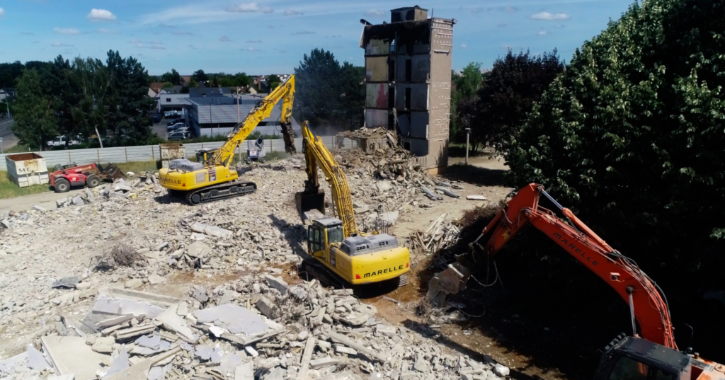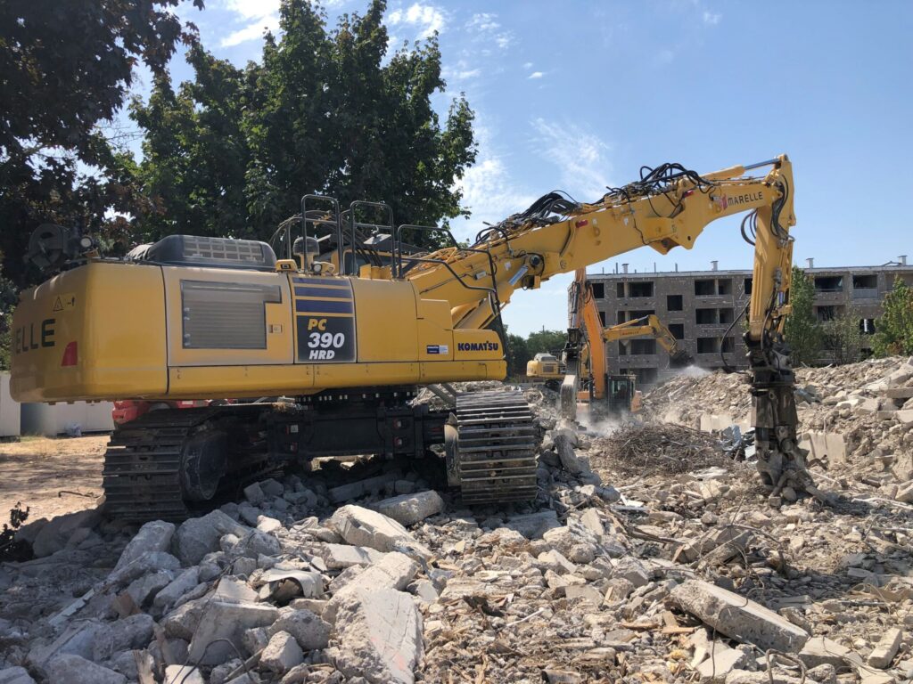 • Déconstruction de la superstructure des 9 bâtiments allant de R+3 à R+4 avec notre nouvelle pelle Komatsu PC390.